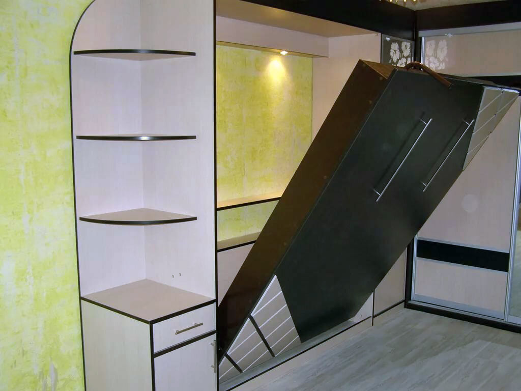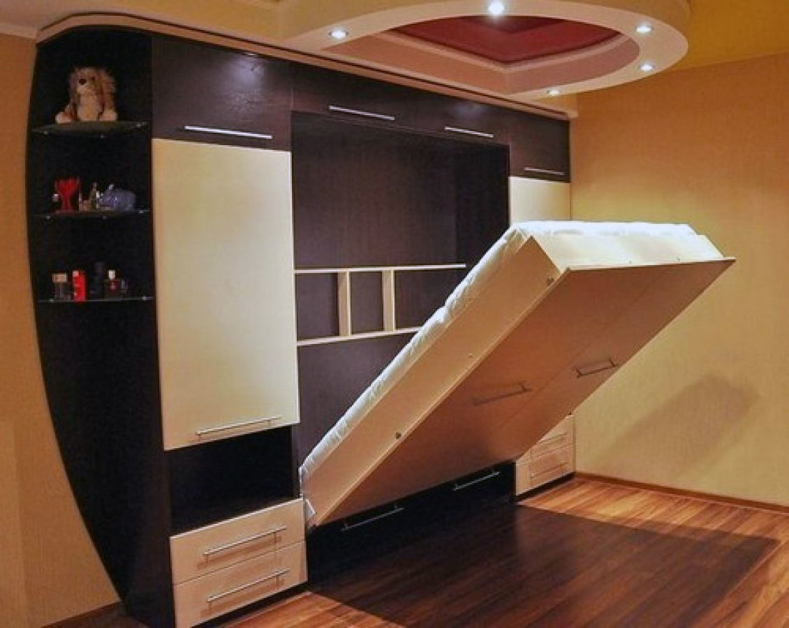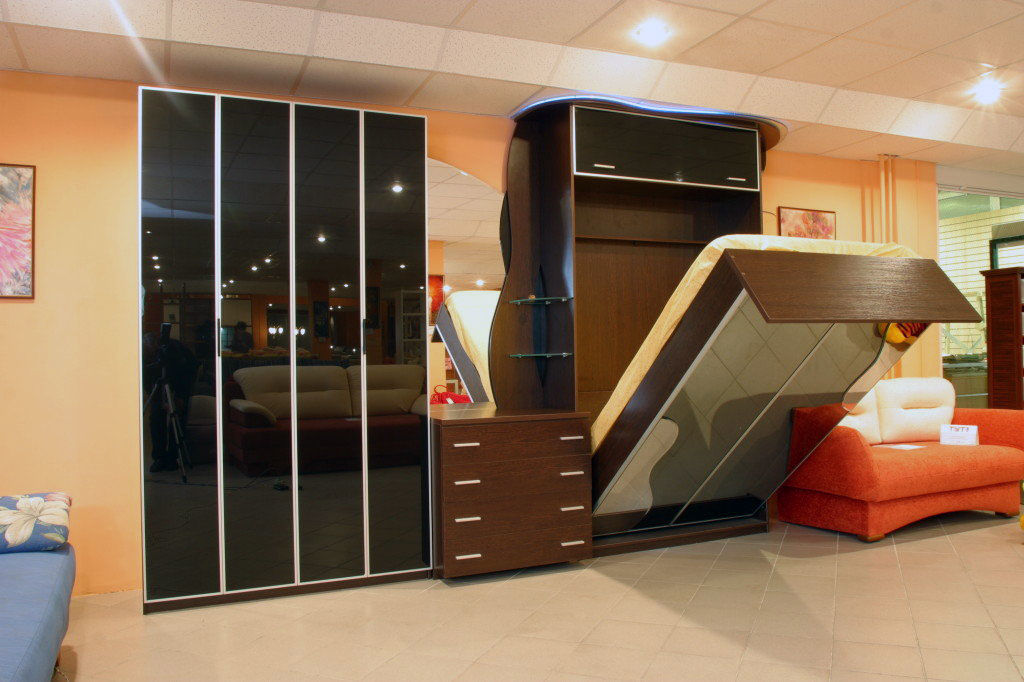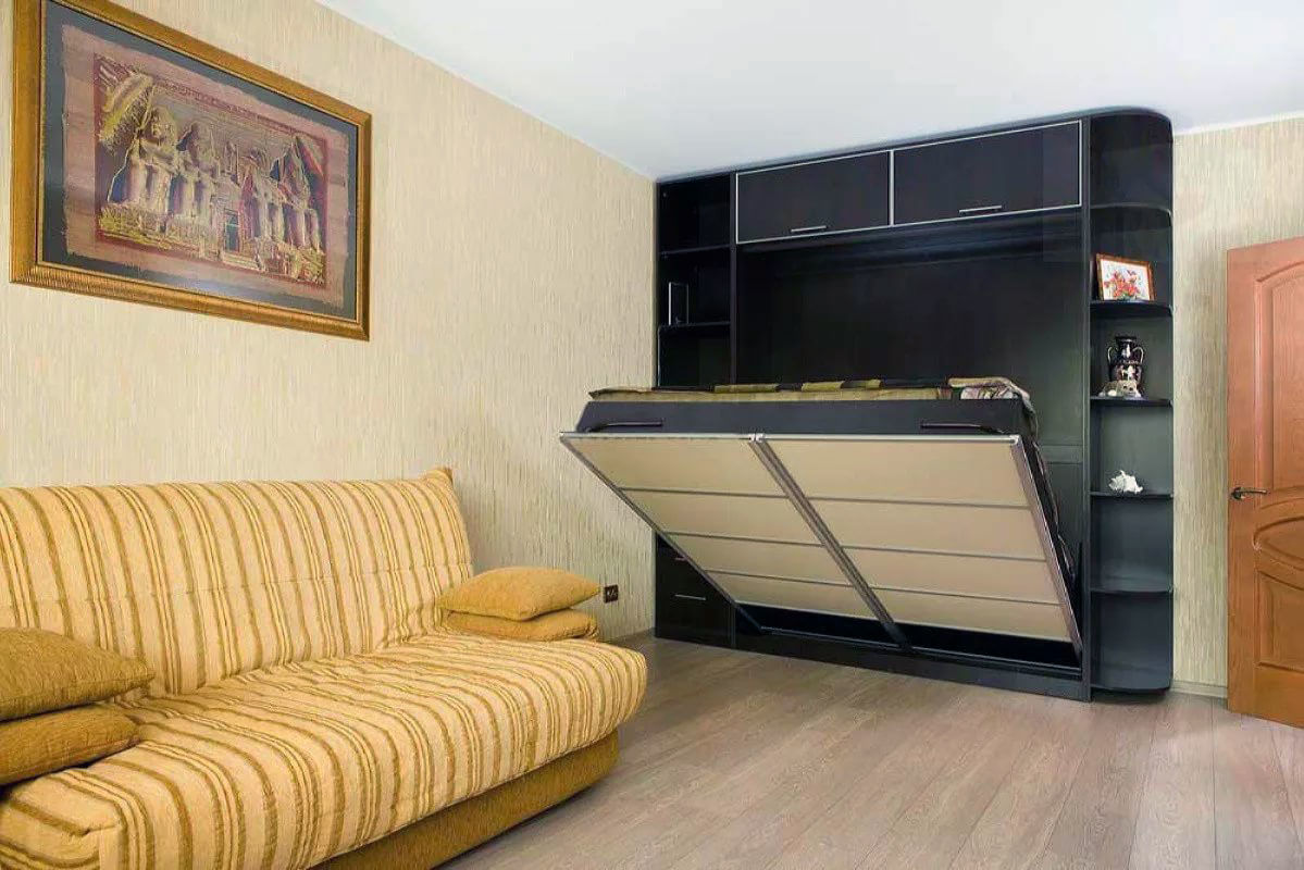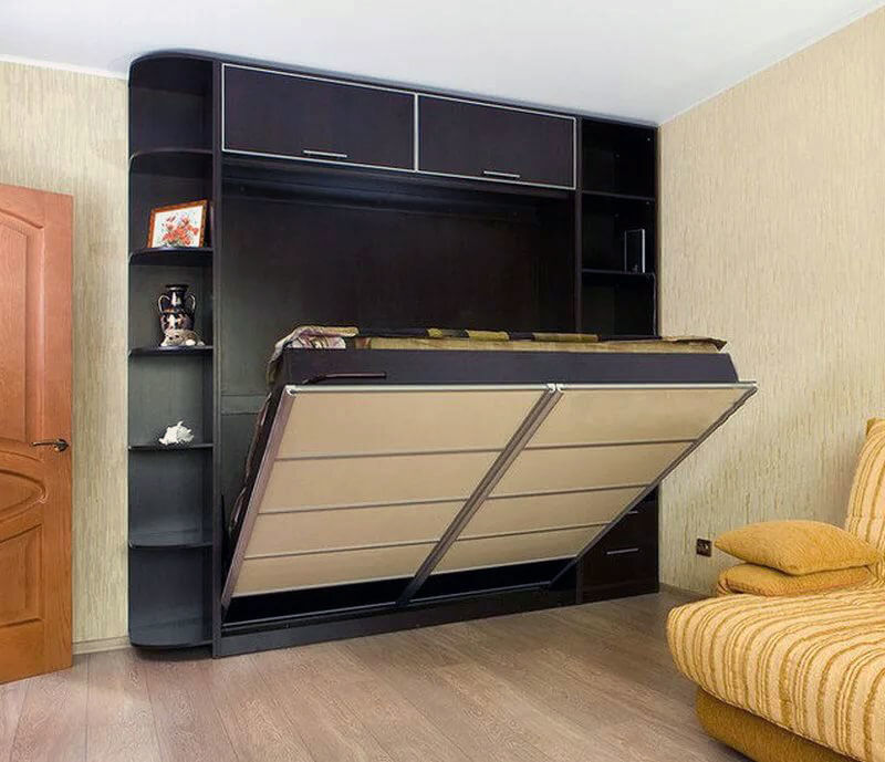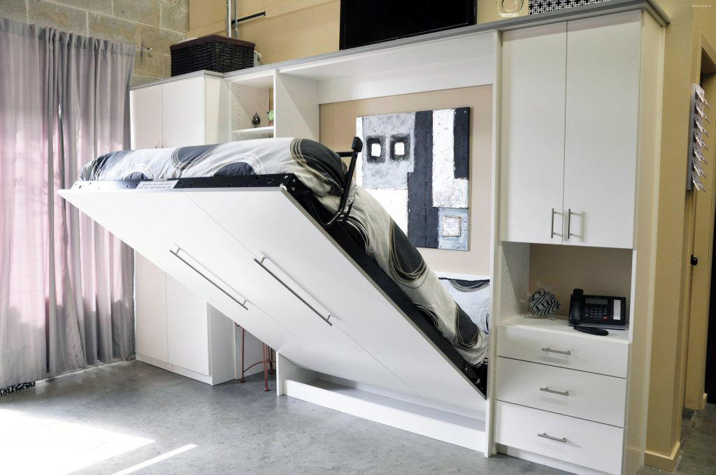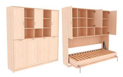 - горизонтальная — за счет бокового поднятия позволяет разместить над сложенной кроватью множество полочек и шкафчиков;