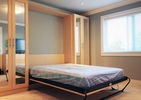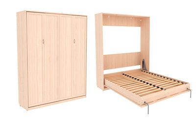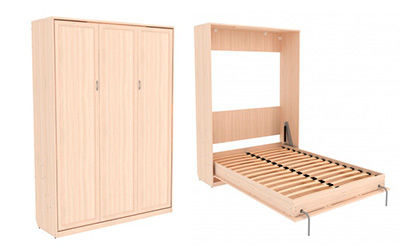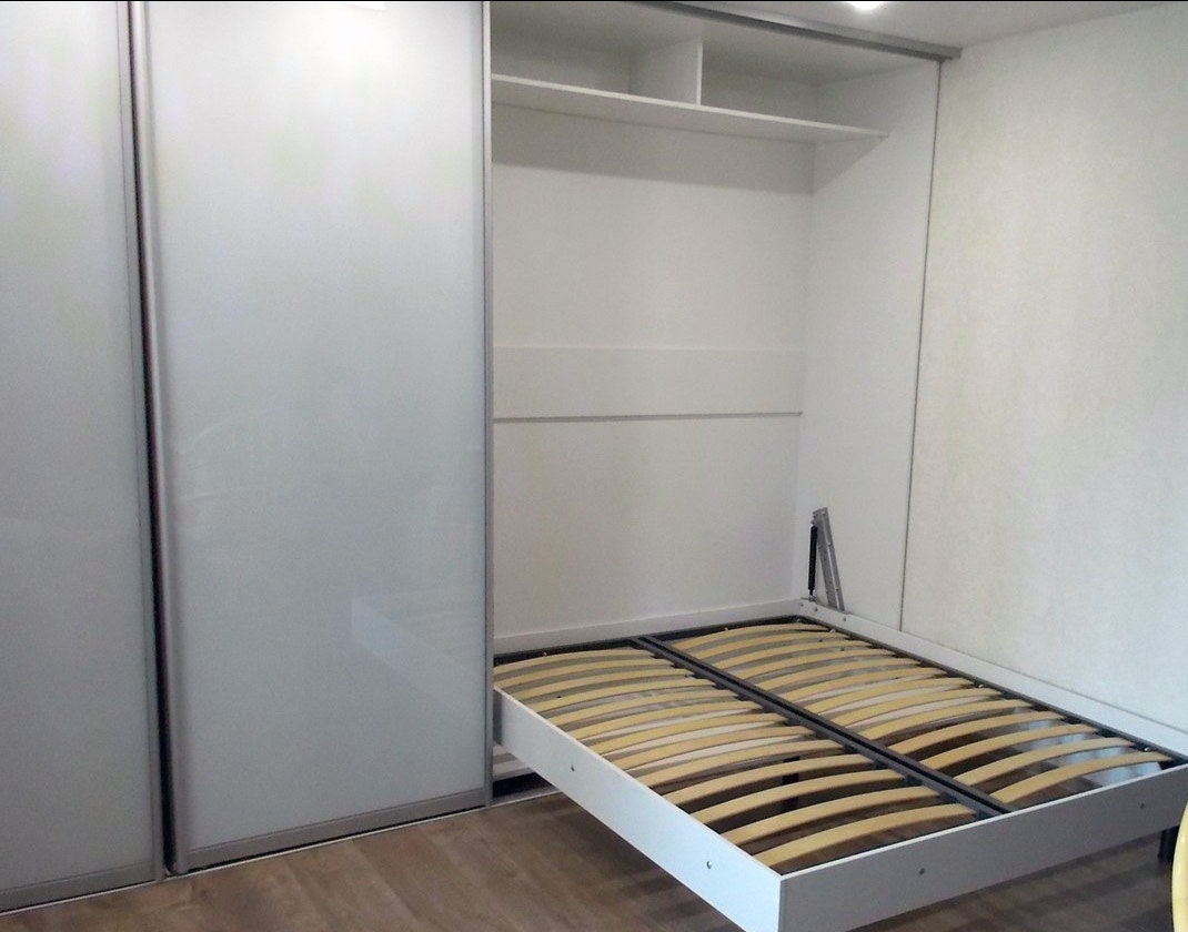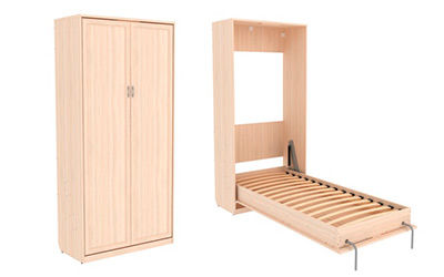Конструкция подъемной кровати состоит из короба, ложа и подъемно-поворотного механизма с газлифтами. В закрытом положении ложе кровати полностью прячется в короб, а подъемно-поворотный механизм закрепляет эту конструкцию в вертикальном положении. После сборки ничто не напоминает о том, что здесь стоит кровать. Визуально она имитирует дверцы обычного шкафа.