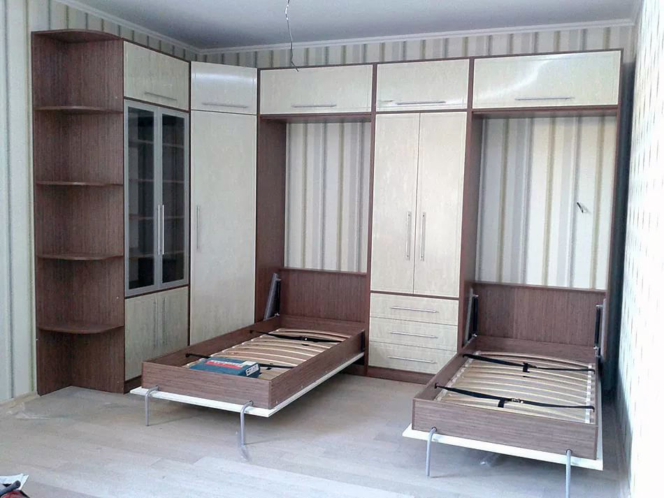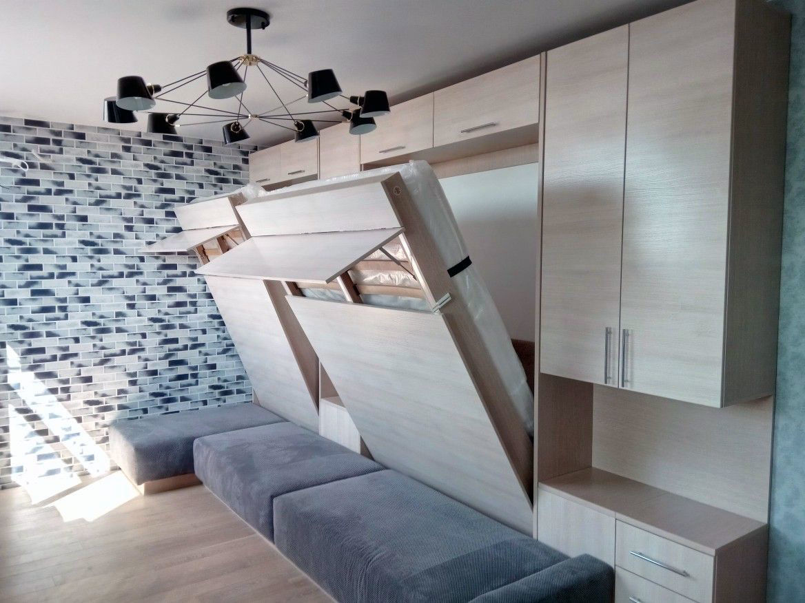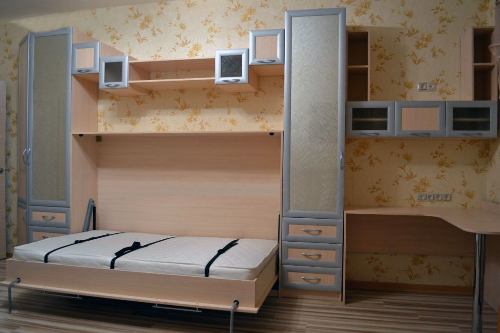 Кровать вместе с матрасом и спальными принадлежностями имеет немалый вес. Для того чтобы просто поднять и зафиксировать ее нужна большая сила. Для удобства использования мы используем в конструкции кровати специальные поворотно-откидные механизмы, благодаря которым убрать спальное место под силу даже подростку.