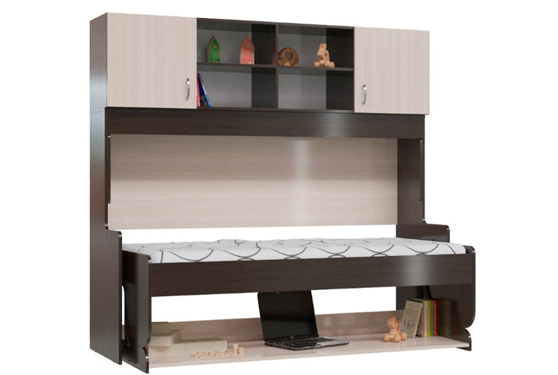 В столе-кровати может быть много полок и ящиков, стеллаж, шкафчики над кроватью и в боковой части комплекта. Мне не очень нравятся такие модели: места в комнате экономят не так уж много, а при эксплуатации нужны дополнительные действия. Часть места в мебели все равно будет использована под хранение постельных принадлежностей.
