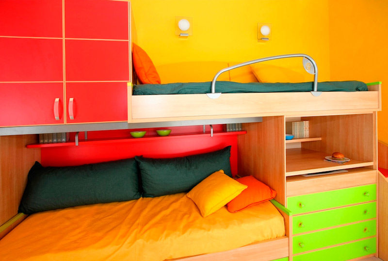 Для двоих детей делают кровати, где в нише вместо столешницы умещается спальный диван. Старший ребенок может спать наверху, а младший — на первом этаже. Есть варианты со шкафами и полками.