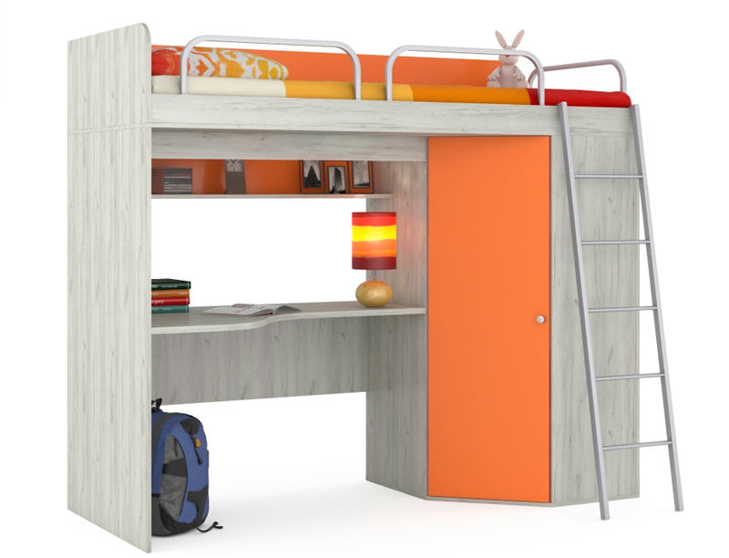 С помощью кровати–чердака для ребенка можно организовать его собственный компактный уголок в любой комнате. Спальное место ребенка расположено на втором ярусе, а под ним находится письменный стол. В некоторых моделях у стола есть еще и выдвижная часть для увеличения рабочей поверхности.
