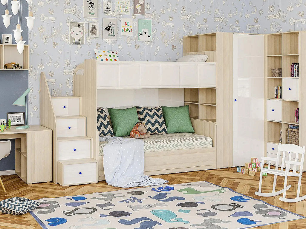 - Лестница должна быть частью кровати и иметь надежное крепление. Отдавайте предпочтение лестницам с поручнями, так малышу будет намного удобнее по ней забираться.