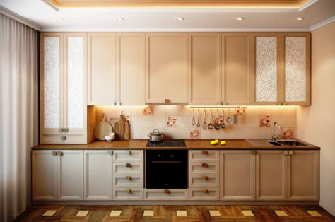 Древесноволокнистая плита (МДФ) производится прессованием древесных стружек, отличается безопасностью, прочностью и долгим сроком службы. Для расширения дизайнерских возможностей и облегчения ухода за кухонной мебелью МДФ покрывают прочной, стойкой к воздействию влаги и моющих средств пленкой ПВХ. Кухонные гарнитуры с фасадами из МДФ, покрытой поливинилхлоридной пленкой ,отличаются отличными эксплуатационными качествами и прекрасно смотрятся в интерьере.
