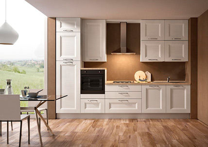 Древесноволокнистая плита (МДФ) производится прессованием древесных стружек, отличается безопасностью, прочностью и долгим сроком службы. Для расширения дизайнерских возможностей и облегчения ухода за кухонной мебелью МДФ покрывают прочной, стойкой к воздействию влаги и моющих средств пленкой ПВХ. Кухонные гарнитуры с фасадами из МДФ, покрытой поливинилхлоридной пленкой ,отличаются отличными эксплуатационными качествами и прекрасно смотрятся в интерьере.
