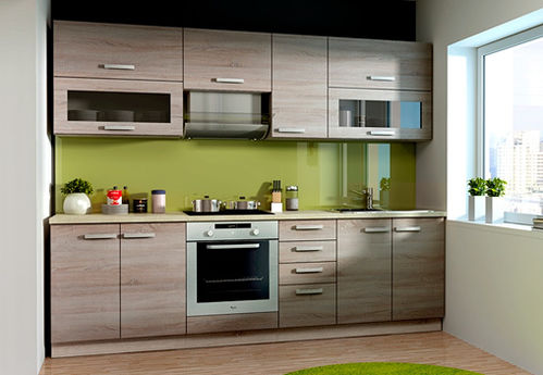 Древесноволокнистая плита (МДФ) производится прессованием древесных стружек, отличается безопасностью, прочностью и долгим сроком службы. Для расширения дизайнерских возможностей и облегчения ухода за кухонной мебелью МДФ покрывают прочной, стойкой к воздействию влаги и моющих средств пленкой ПВХ. Кухонные гарнитуры с фасадами из МДФ, покрытой поливинилхлоридной пленкой ,отличаются отличными эксплуатационными качествами и прекрасно смотрятся в интерьере.