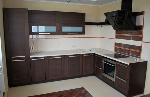 Древесноволокнистая плита (МДФ) производится прессованием древесных стружек, отличается безопасностью, прочностью и долгим сроком службы. Для расширения дизайнерских возможностей и облегчения ухода за кухонной мебелью МДФ покрывают прочной, стойкой к воздействию влаги и моющих средств пленкой ПВХ. Кухонные гарнитуры с фасадами из МДФ, покрытой поливинилхлоридной пленкой ,отличаются отличными эксплуатационными качествами и прекрасно смотрятся в интерьере.