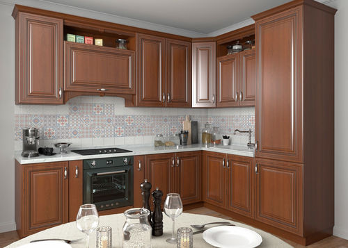 Древесноволокнистая плита (МДФ) производится прессованием древесных стружек, отличается безопасностью, прочностью и долгим сроком службы. Для расширения дизайнерских возможностей и облегчения ухода за кухонной мебелью МДФ покрывают прочной, стойкой к воздействию влаги и моющих средств пленкой ПВХ. Кухонные гарнитуры с фасадами из МДФ, покрытой поливинилхлоридной пленкой ,отличаются отличными эксплуатационными качествами и прекрасно смотрятся в интерьере.