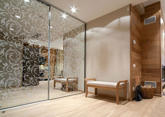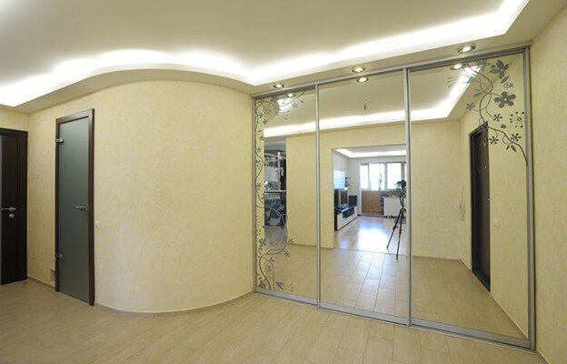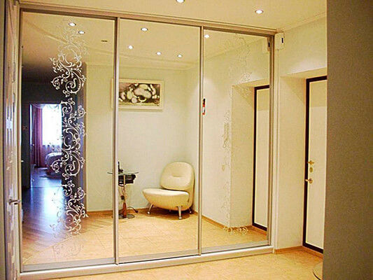 Зеркальные шкафы-купе, идеально впишутся практически в любой интерьер. С зеркалом могут комбинироваться и другие элементы: пескоструйный рисунок, фотопечать и стеклянные фасады. Данный вид шкафов отлично подойдёт для прихожих, спален, гостиных и детских комнат, поскольку зеркало визуально увеличивает помещение и наполняет комнату светом.