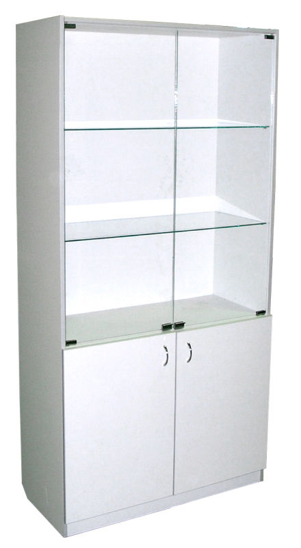 Шкаф имеет два отделения. Верхнее отделение с двумя дверями и двумя полками из стекла. Нижнее отделение с двумя дверями и полкой из ЛДСП.