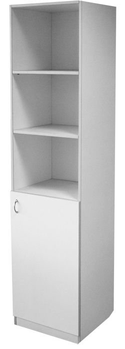 Шкаф имеет два отделения. Верхнее отделение с двумя открытыми полками. Нижнее отделение с дверью и полкой.