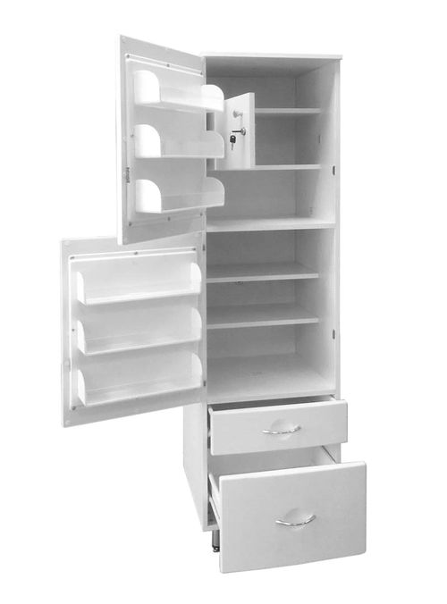 Двери оснащены замками. К каждой двери прикреплена полка для хранения фармпрепаратов, выполненная из высокопрочного ПВХ. Данная полка имеет три стационарных лотка со съёмными прозрачными ограждениями толщиной 4 мм.