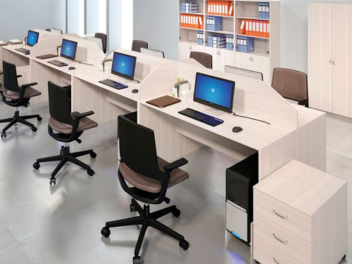 Изготовлен из ЛДСП 16 мм с отделкой кромочным пластиком 0,4 мм. На четыре рабочих места.