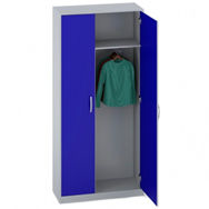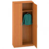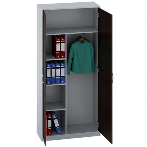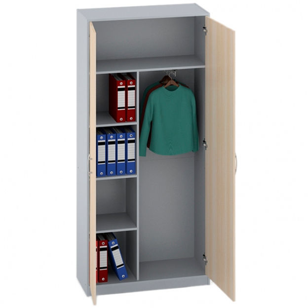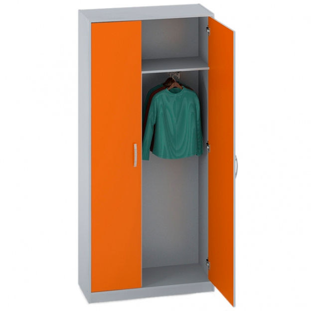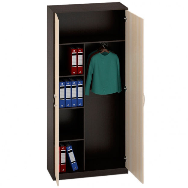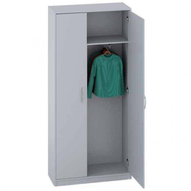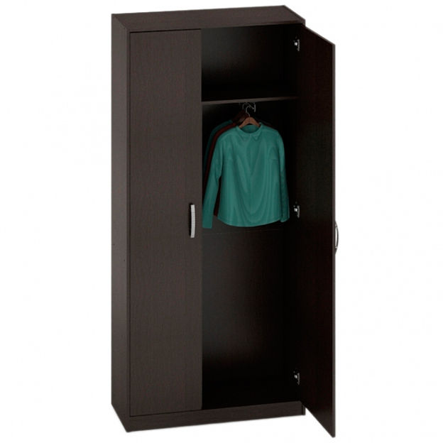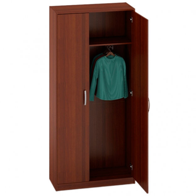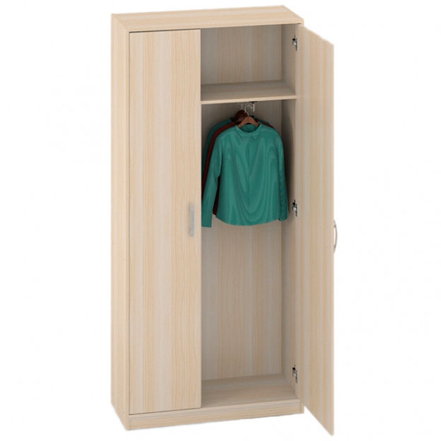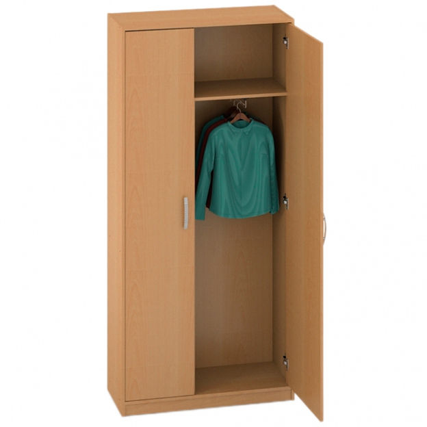 Изготовлен из ЛДСП 16 мм. с отделкой кромочным пластиком 0,4мм. Оснащены: металлическими ручками, металлическими петлями с углом открывания двери 90 гр, две распашные дверцы, сверху – полка для головных уборов, одна часть - штанга для одежды или евровешалка, вторая - 4 полки.