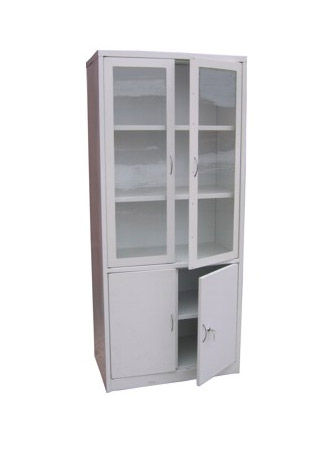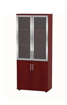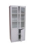 Изготовлен из ЛДСП 16 мм. с отделкой кромочным пластиком 0,4мм. Оснащены: металлическими ручками, металлическими петлями с углом открывания двери 90 гр, 5 полок, нижняя часть две распашные дверцы ЛДСП, верхняя – рамка МДФ со стеклом 4мм. две распашные дверцы.