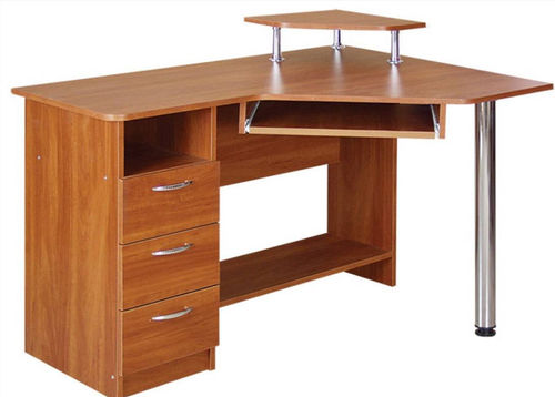 Стол компьютерный угловой с выкатной полкой (роликовые направляющие) с 3-мя встроенными ящиками и нишей. Надстройка полка под монитор на хромированных опорах.