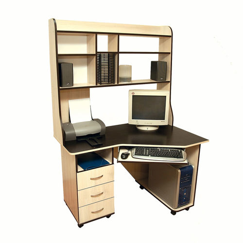 Стол компьютерный угловой на колесах, с выкатной полкой (роликовые направляющие) и тремя встроенными ящиками с нишей, включена полка под системный блок. Надстройка – открытые полки разный размеров.