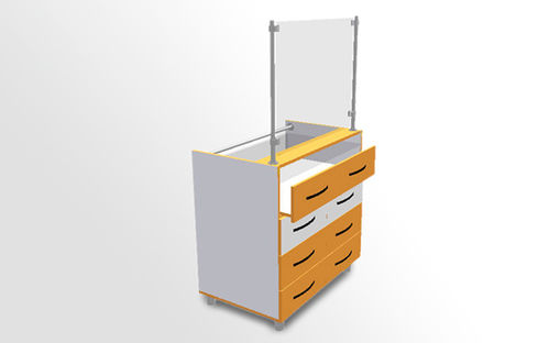 Также обязательно необходимы кассовые прилавки (их количество зависит от числа запланированных кассовых мест). Вариант кассового прилавка зачастую изготавливается глухой конструкции для установки компьютера и кассового аппарата на столешницу, со специальной прорезью для приема-передачи денег и препаратов.