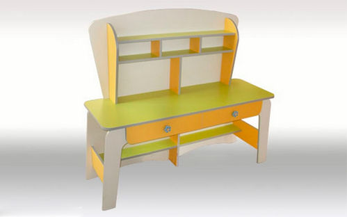 Составляющие стола изготовлены из ламинированного цветного ДСП толщиной 16 мм (цвета - беж + желтый + зеленая вода), торцы обклеены противоударной кромкой ПВХ толщиной 2 мм.