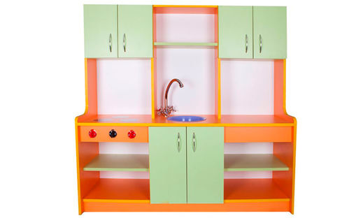 Кухня изготовлена из ламинированного цветного ДСП (цвета - желтый, салатовый (лайм), синий, апельсин, лаванда, розовый, бежевый). Торцы обклеены противоударной кромкой ПВХ. Кухня украшена настоящим краном, мисочкой в виде мойки, настоящими ручками для газовой плиты, кружочками-наклейками в виде конфорок.
